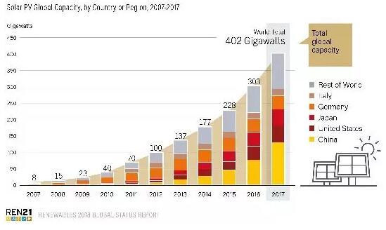 太陽能光伏新增裝機容量達到創(chuàng)紀錄的水平: 與2016年相比,太陽能光伏發(fā)電裝機總量增加了29%,達到98GW。光伏新增裝機容量大于燃煤、天然氣和核電凈增裝機容量之和。此外,全球風電新增裝機容量52GW,也對可再生能源總裝機容量起到了擴充作用。