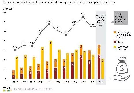 但對新增可再生能源發(fā)電的投資已超過對新增化石燃料和核能發(fā)電投資總和的兩倍以上。 由于成本競爭力的提高,2017年可再生能源投資占電力行業(yè)總投資的比例超過三分之二,同時可再生能源在電力行業(yè)的份額仍將會繼續(xù)上升。