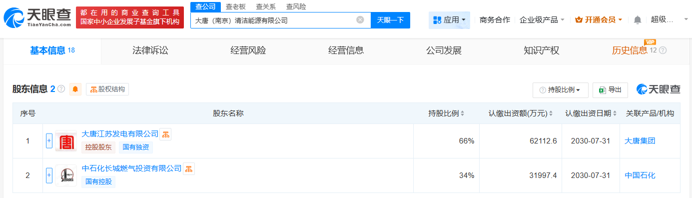 天眼查App顯示,近日,大唐(南京)清潔能源有限公司成立,法定代表人為張志勇,注冊資本約9.4億人民幣,經營范圍包括熱力生產和供應、電氣設備修理、固體廢物治理、儲能技術服務等。股東信息顯示,該公司由大唐江蘇發電有限公司、中石化長城燃氣投資有限公司共同持股。