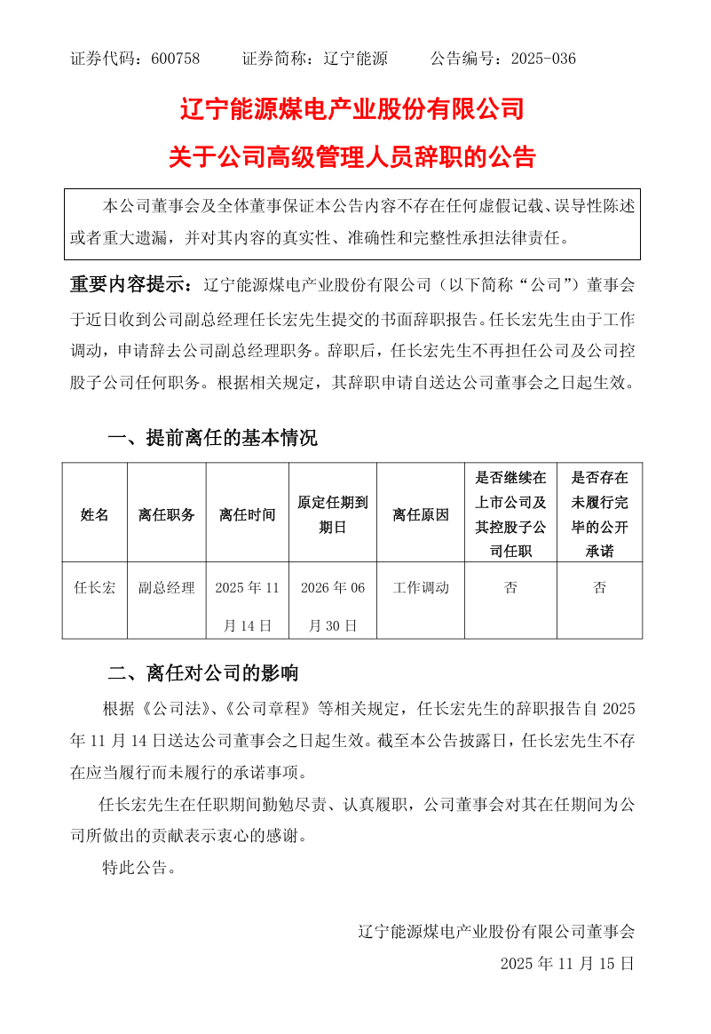 11月14日,遼寧能源發布公告稱,公司董事會于近日收到公司副總經理任長宏先生提交的書面辭職報告。任長宏先生由于工作調動,申請辭去公司副總經理職務。辭職后,任長宏先生不再擔任公司及公司控股子公司任何職務。