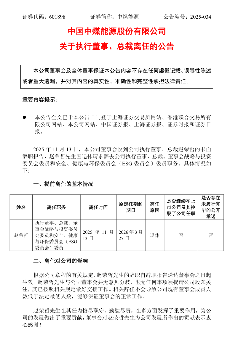 11月14日,中煤能源發布公告稱,11月13日,公司董事會收到公司執行董事、總裁趙榮哲的書面辭職報告,趙榮哲先生因退休請求辭去公司執行董事、總裁、董事會戰略與投資委員會委員和安全、健康與環保委員會(ESG委員會)委員職務。