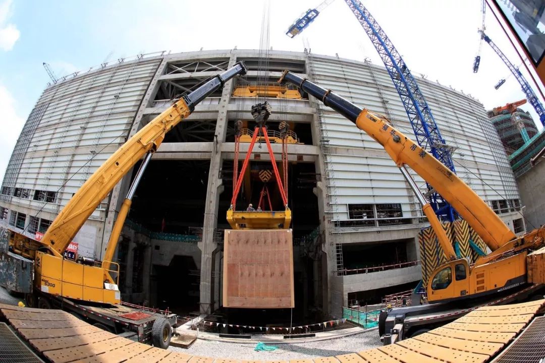 凝汽器是常規(guī)島最大的輔機(jī)設(shè)備,殼體則是凝汽器的重要部件之一,共有4個(gè)模塊,最重模塊達(dá)到148噸, 采用模塊化供貨安裝,在現(xiàn)場組對拼焊成一個(gè)整體。本次殼體模塊吊裝采用廠房外大型履帶吊起重機(jī)和廠房內(nèi)橋式起重機(jī)相互配合方式,通過抬吊和連續(xù)換鉤等工序完成吊裝作業(yè)。