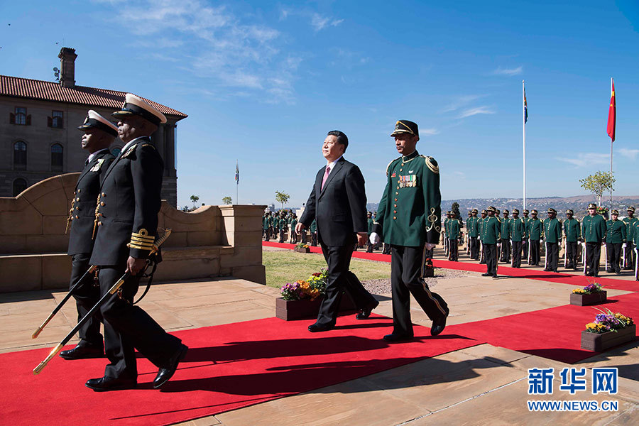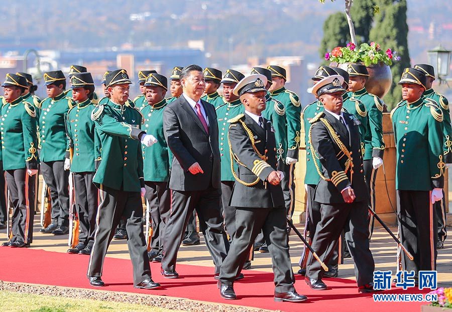 總統(tǒng)府前廣場(chǎng),微風(fēng)拂面,陽(yáng)光和煦。中南兩國(guó)國(guó)旗迎風(fēng)飄揚(yáng)。習(xí)近平和夫人彭麗媛受到拉馬福薩和夫人莫采佩熱情迎接。兩國(guó)元首夫婦登上檢閱臺(tái)。儀仗隊(duì)行持槍禮。軍樂(lè)隊(duì)奏中國(guó)國(guó)歌。現(xiàn)場(chǎng)鳴放21響禮炮。習(xí)近平檢閱儀仗隊(duì)。軍樂(lè)隊(duì)奏南非國(guó)歌。習(xí)近平和彭麗媛同南方主要官員握手。拉馬福薩夫婦同中方陪同人員握手。兩國(guó)元首夫婦親切寒暄。拉馬福薩對(duì)習(xí)近平在南中建交20周年之際訪問(wèn)南非并出席金磚國(guó)家領(lǐng)導(dǎo)人會(huì)晤表示熱烈歡迎。