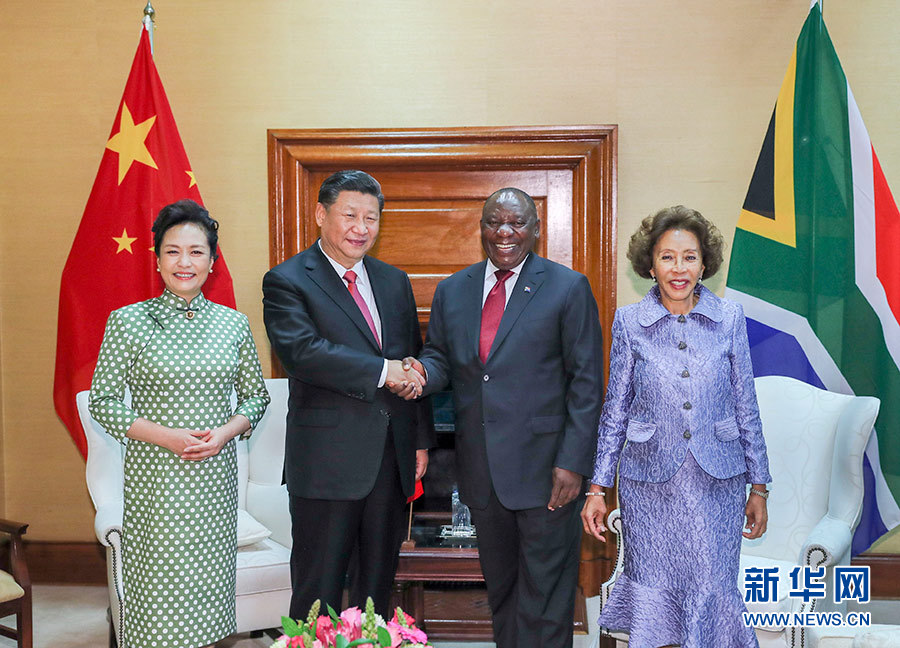 7月24日,國(guó)家主席習(xí)近平在比勒陀利亞同南非總統(tǒng)拉馬福薩舉行會(huì)談。這是會(huì)談前,習(xí)近平和夫人彭麗媛同拉馬福薩和夫人莫采佩合影。(圖片來(lái)源:新華社 謝環(huán)馳攝)