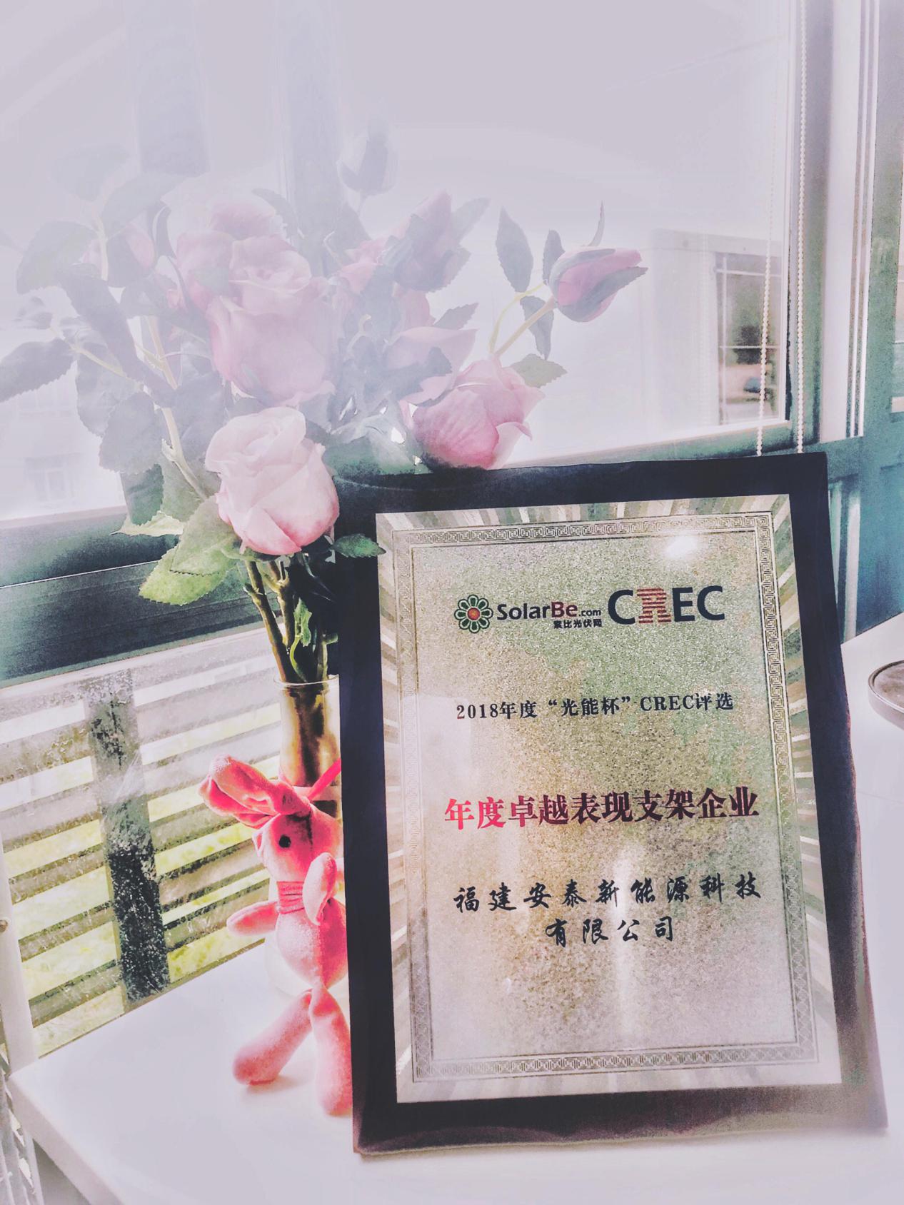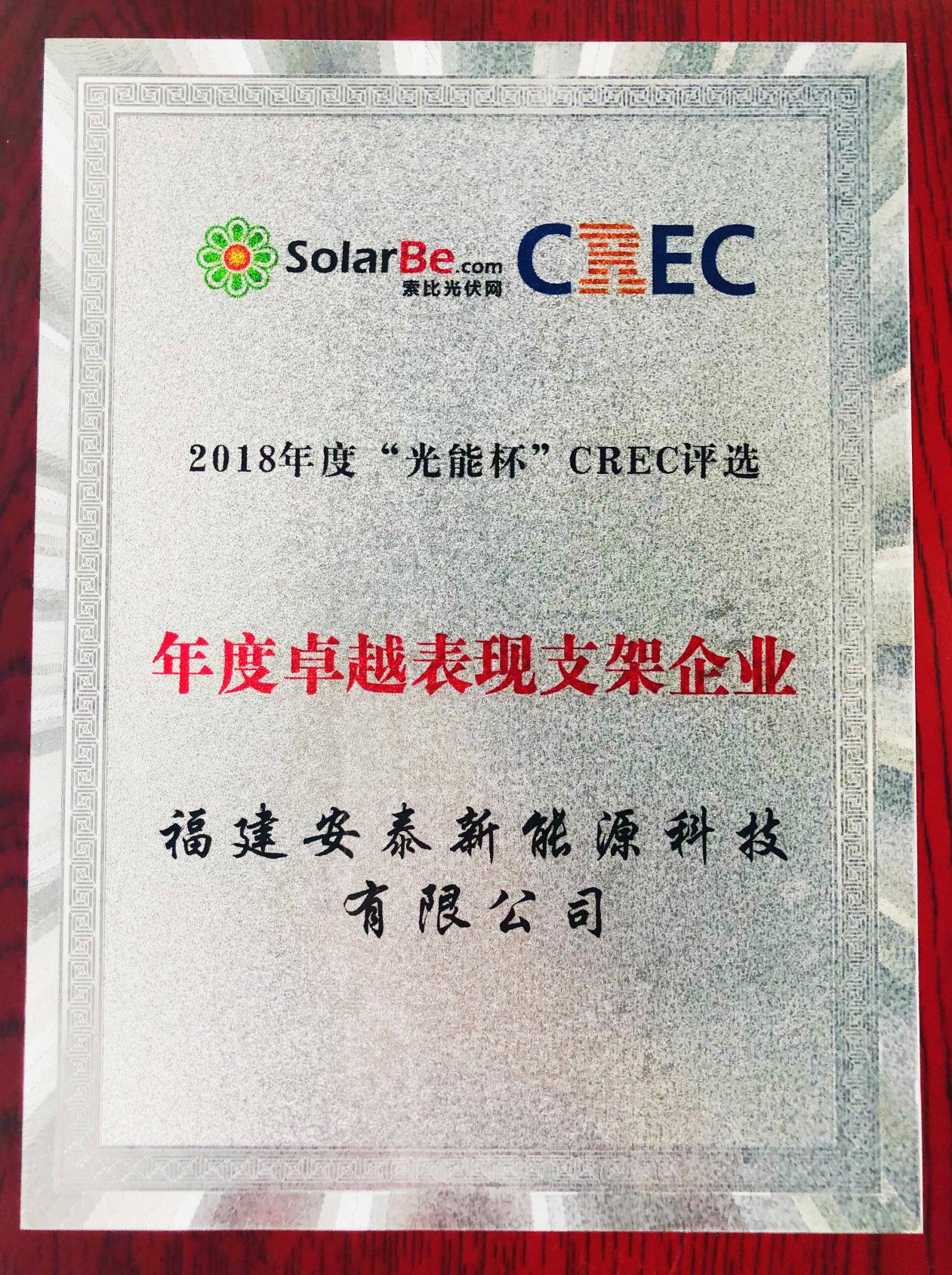2018年“光能杯”CREC光伏行業(yè)評(píng)選頒獎(jiǎng)盛典于10月31日晚在無(wú)錫正式拉開帷幕,作為國(guó)內(nèi)領(lǐng)先的光伏支架企業(yè),憑借優(yōu)秀的市場(chǎng)口碑以及項(xiàng)目實(shí)績(jī),福建安泰新能源科技有限公司成功斬獲“年度卓越表現(xiàn)支架企業(yè)”大獎(jiǎng)。