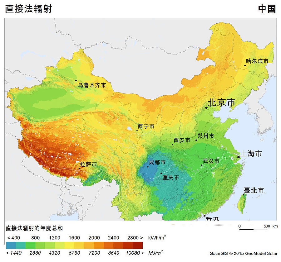 圖:中國太陽直接法向輻射DNI分布(Solargis)